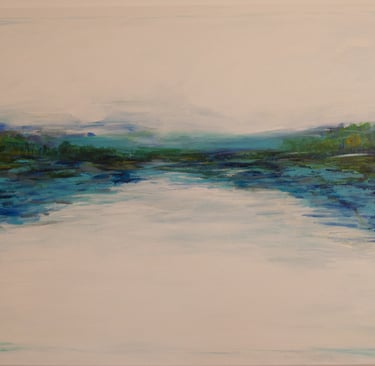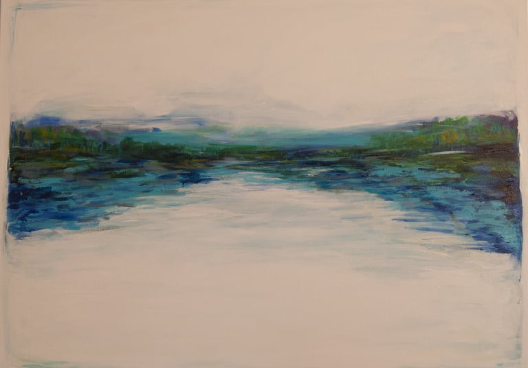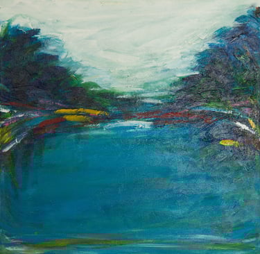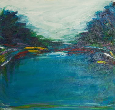 A fleeting moment of serenity inspired by early morning reflections on a quiet river. The vibrant blues of the water set a calming foundation, while bold strokes of red, yellow, and violet bring life and movement to the piece.