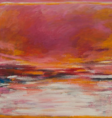 This abstract painting captures the striking beauty of a sunset over water. Fiery tones spill across the calm surface in reflection. Bold colors and textured brushstrokes convey the energy and emotion of nature’s fleeting moment.